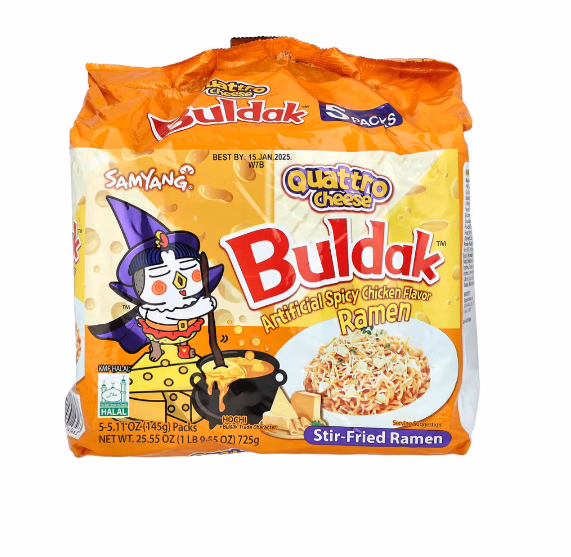 Samyang Quattro Cheese är äntligen här för alla Samyang– och ostälskare där ute! Som om Samyang Cheese inte var fantastisk nog, så kommer äntligen Samyang Quattro Cheese. Ännu krämigare och ännu mer ost-smak (tack vare att den är smaksatt med fyra olika osttyper!), som såklart kompletteras av den underbara hettan som Buldak-nudlarna bjuder på och vi alla kommit att älska. I vår mening bjuder Quattro Cheese på den bästa balansen mellan hetta och ost som vi provat. Koka nudlarna i cirka 5 minuter. Spara någon matsked nudelvatten och sedan sila nudlarna. Häll nudlarna i en skål tillsammans med smaksättningen samt det sparade nudelvattnet, sedan blanda och njut! 145g.